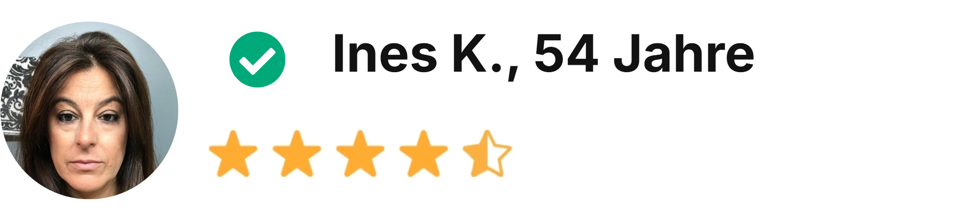 „Ich hatte bereits nach der dritten Anwendung das Gefühl, dass meine Haut sich deutlich glatter anfühlt, aber nach 8 Wochen ist der Unterschied wirklich sichtbar. Die Mundfalten, die mich immer gestört haben, sind fast verschwunden, und auch die Haut um meine Augen sieht viel frischer aus. Ich fühle mich insgesamt jünger und straffer, und der Effekt ist viel langanhaltender als bei anderen Produkten, die ich vorher ausprobiert habe. Ich bin wirklich begeistert!“